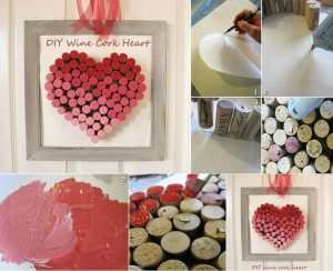 - Como puedes ver en la foto, deberás dibujar en la cartulina un corazón que te hará de guía para pegar los tapones de corcho. Después de dibujarlo, con pegamento, vuelve a dibujar el borde del corazón y ve pegando los corchos. Es importante que empieces formando este dibujo y no por el centro, ya que podría perder la forma principal.