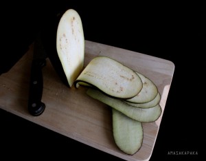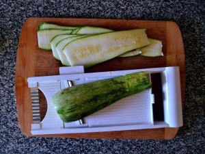 - Luego de lavarlas, corta todas las verduras en láminas muy finas de 60-70 cm de ancho. Esto es recomendable hacerlo con una mandolina. En caso de no tener una puedes usar un cuchillo bien afilado.