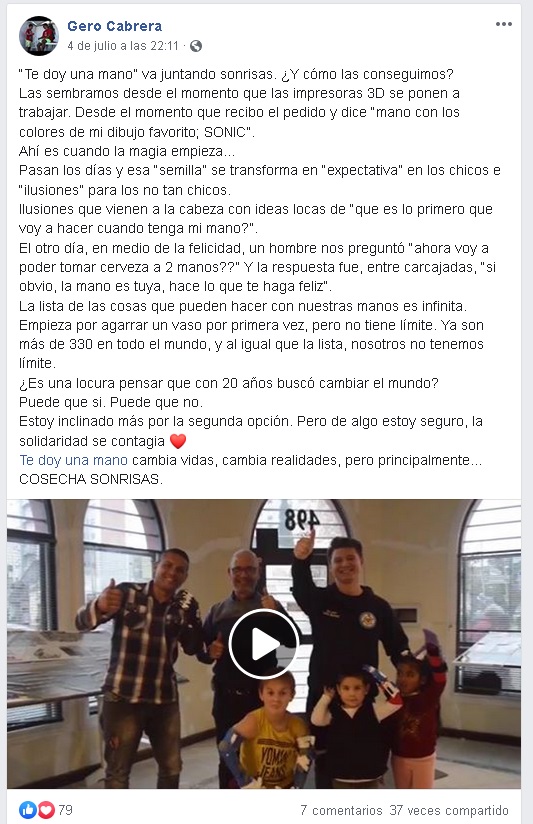 “Empezamos de casualidad con esto, mi papá fue Bombero y ayudó mucho a hogares y comedores. Él me inculcó el amor por ayudar a otras personas sin esperar nada a cambio. Por la tele vio un informe de las prótesis y me dijo que lo ayude a conseguir una impresora 3D, así empezamos», explica Gerónimo