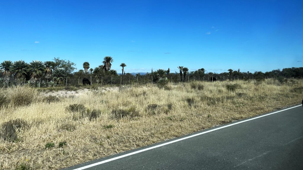 Llegamos a Mina Clavero y doblamos hacia el norte, tomando la Ruta Provincial N° 15. Al transitar media hora, comenzamos a ver grandes extensiones de palmera caranday que poco tienen que ver con las grandes avenidas de Miami. Es nuestra, la queremos y la cuidamos: hace unos años, un alemán se dio el lujo de arrancarlas de cuajo y llevar varias palmeras envueltas en film a sus propios pagos. En aquel momento, eso se podía. Hoy, gracias a las regulaciones, las caranday son nuestras y se van a quedar donde pertenecen.