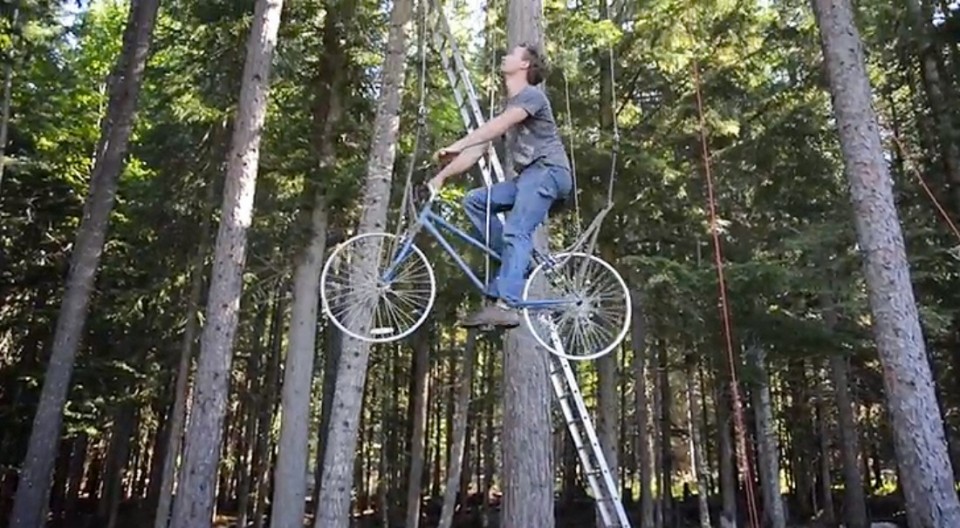 La bicicleta se puso sobre una cadena gigante, que sirve como una especie de riel, y mediante el pedaleo lo deja justo en la puerta de su hogar en las alturas.
