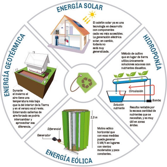 Posibilidades: generación de energía para alimentar una heladera, biogás con residuos, filtrado del agua y tratamiento eficiente, geotermia para calefaccionar o enfriar la casa según la estación, entre otras.