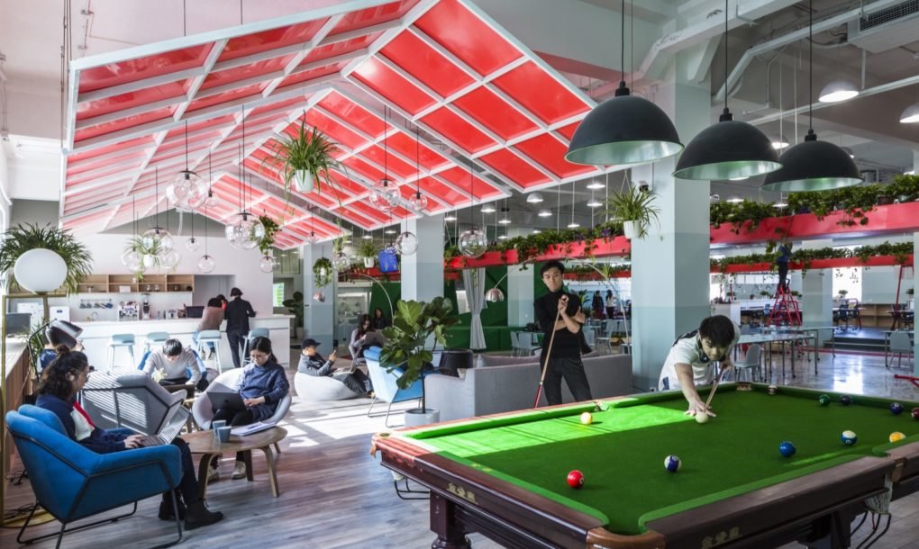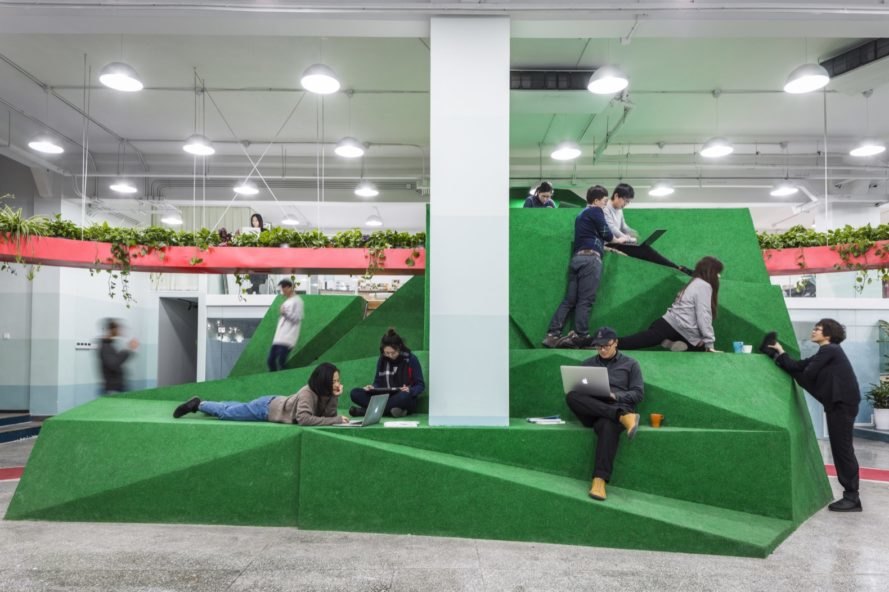 Diseñado por la prolífica práctica de diseño local People’s Architecture Office (PAO), el entorno de oficinas en su mayoría de planta abierta se creó para fomentar la salud y el bienestar. Con una superficie de 1,100 metros cuadrados, la sede de la Fundación de Emprendedores Sociales de Leping reúne a cuatro de los departamentos de la compañía con un circuito de vegetación suspendido y una pista para correr debajo.