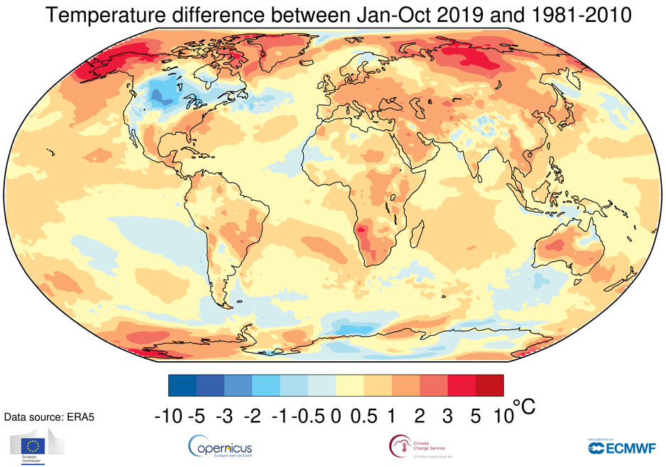 El año 2019 pone punto final a una década marcada por registros de calor excepcionales, por el retroceso de los hielos y por subidas del nivel del mar sin precedentes a nivel mundial, cambios exacerbados por las emisiones de gases de efecto invernadero fruto de la actividad humana. Casi con toda certeza, las temperaturas medias del quinquenio (2015-2019) y de la década (2010-2019) serán las más elevadas de las que se tiene constancia. Según la Organización Meteorológica Mundial (OMM), todo apunta a que 2019 será el segundo o tercer año más cálido del que se tienen datos.